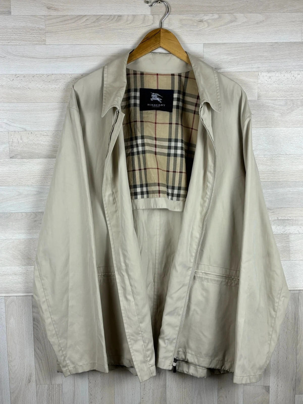 Chaqueta Harrington Burberry London en color beige con icónico forro interior a cuadros Nova Check, talla 8, corte amplio tipo unisex ideal como efecto oversize L/XL.
