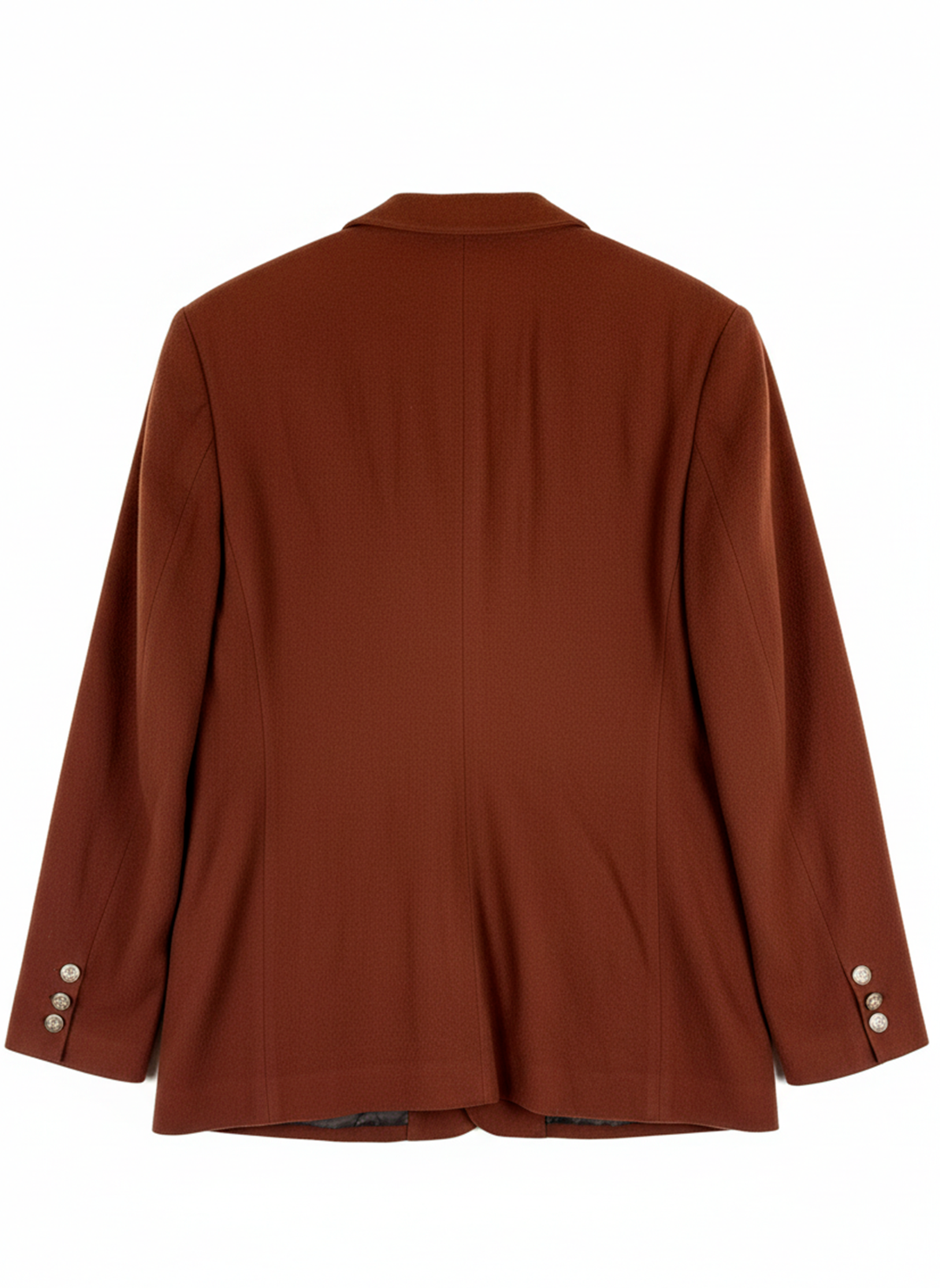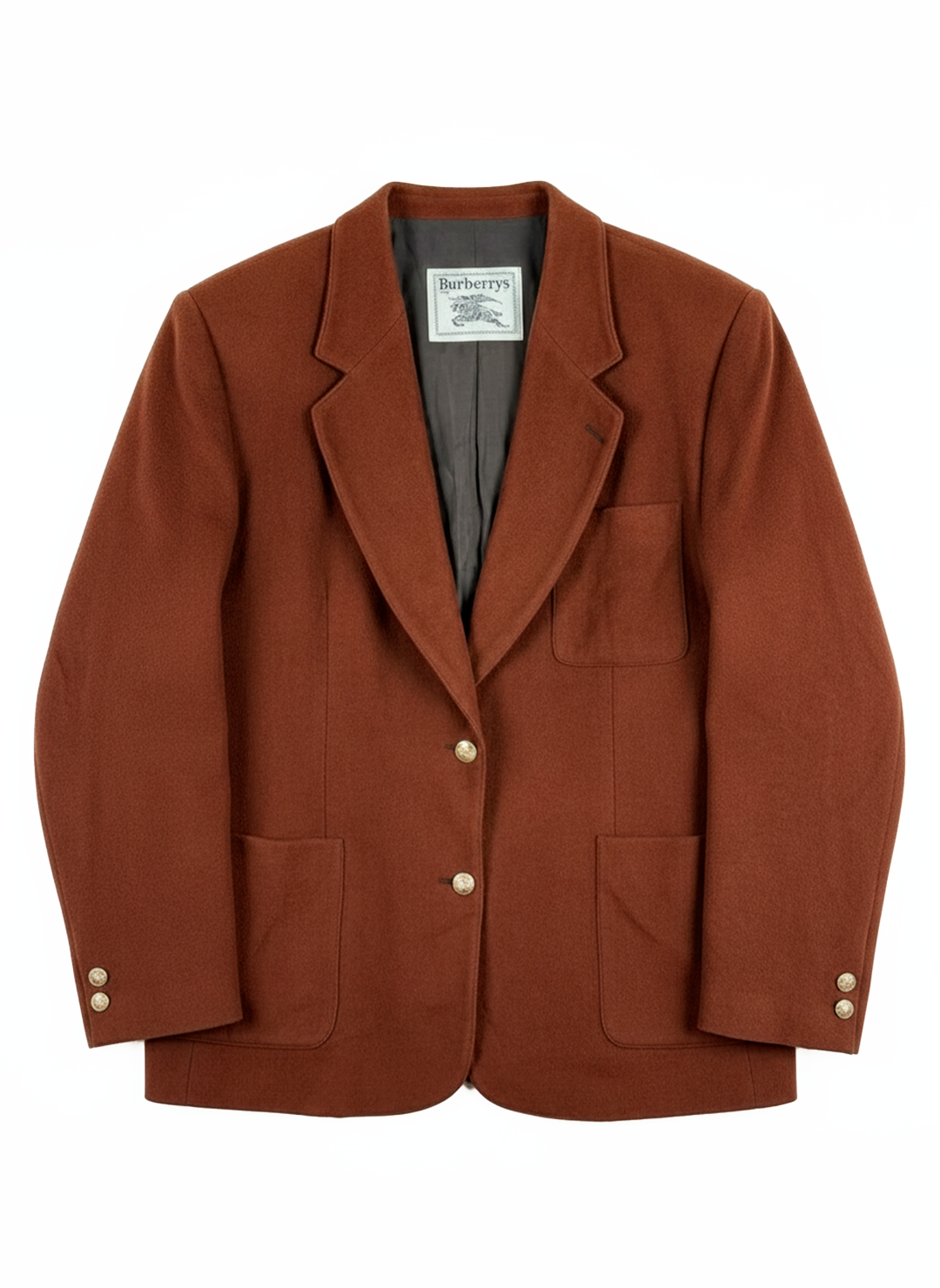 Americana UNISEX Burberrys vintage en tono marrón cálido, confeccionada en mezcla de lana virgen y cashmere, con forro interior suave en viscosa. Corte clásico de dos botones con bolsillos de parche frontales, bolsillo en el pecho y botones metálicos con el logo ecuestre de la marca, ideal para looks formales o smart casual en otoño e invierno. Talla indicada 36/46; recomendable comparar con una americana similar para asegurar el fit antes de comprar.