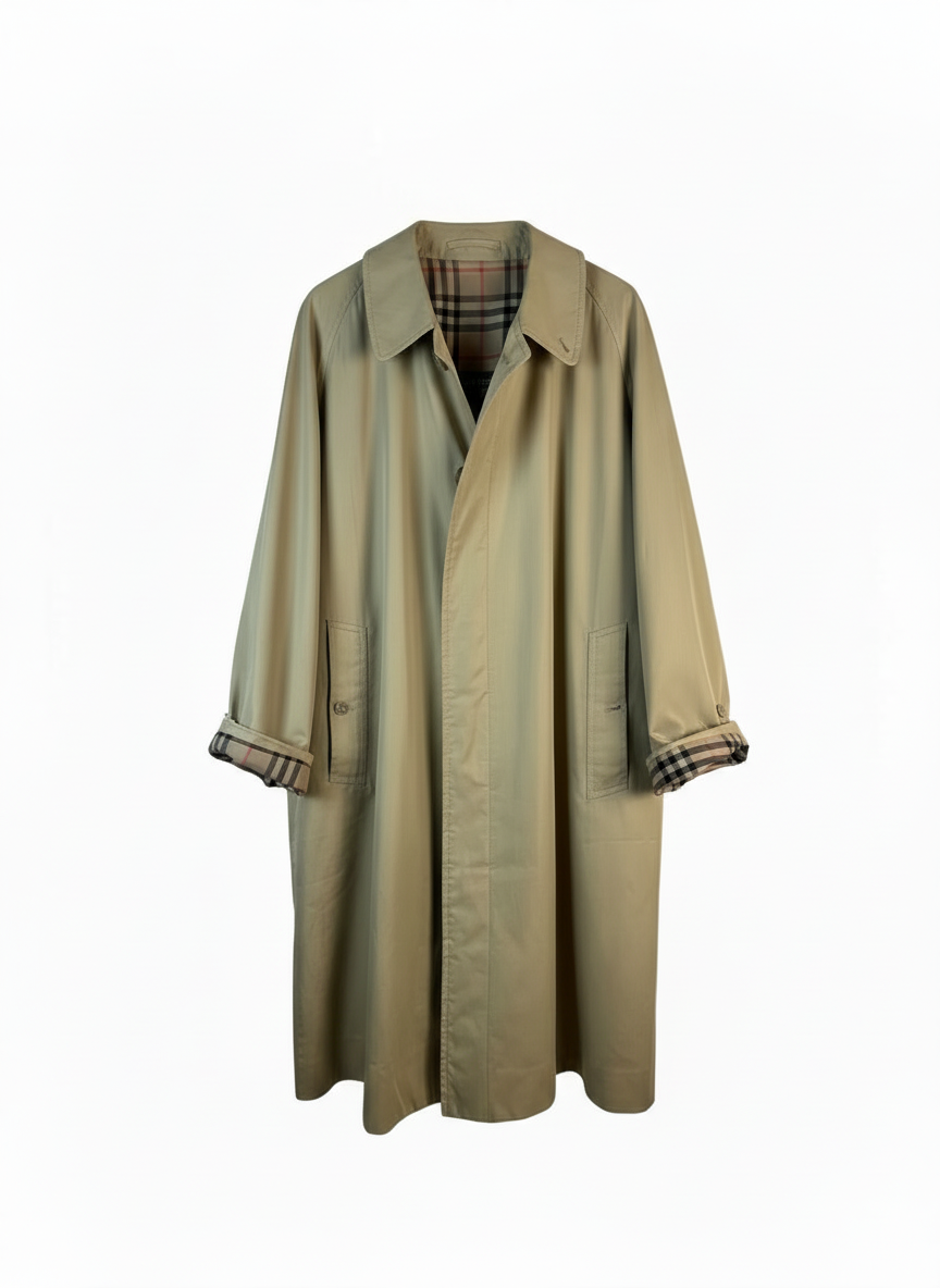 Trench coat Burberry original de los años 80, una pieza clásica en tono beige con la icónica forrería Check visible en el interior y en los puños. Presenta una silueta amplia, cierre frontal oculto y bolsillos laterales con botón, manteniendo el estilo tradicional de la marca.